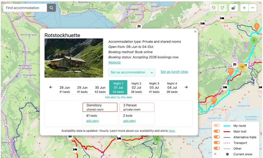 All our self-guided Bernese Oberland packages include access to our new planning app. The app shows the booking status for all accommodation locations, with a “Book now” link. We redirect you to their preferred booking method, including directly on their website, their online booking engine partner, or email.