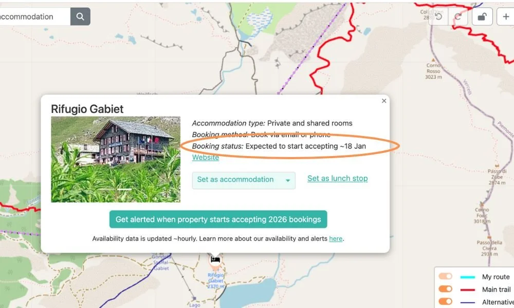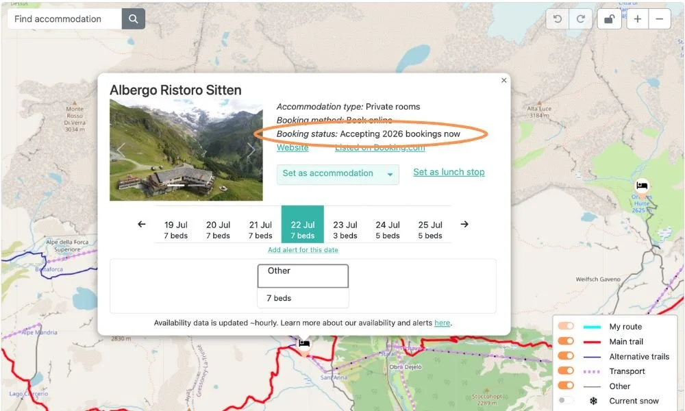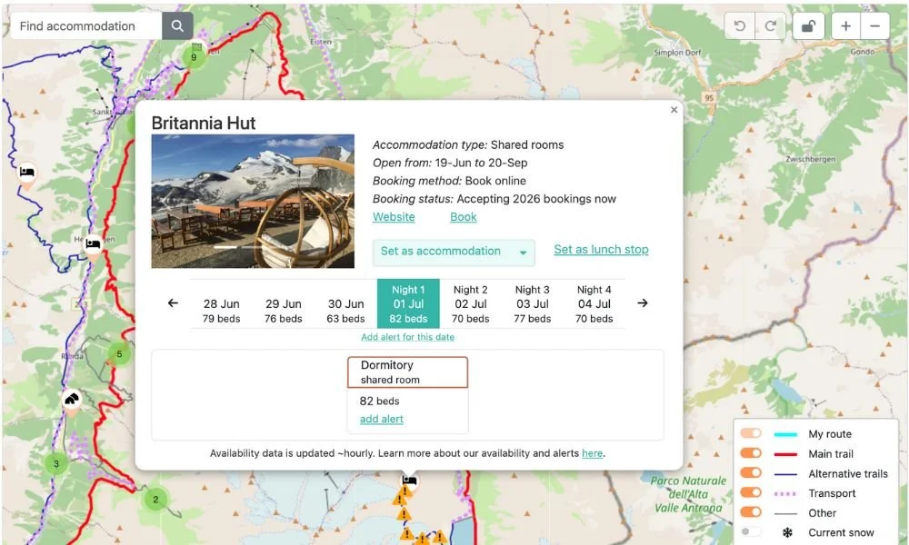 All our self-guided Tour of Monte Rosa packages include access to our new planning app (now live!). The app shows the booking status for all accommodation locations, with a “Book now” link. We redirect you to their preferred booking method, including directly on their website, their online booking engine partner, or email.