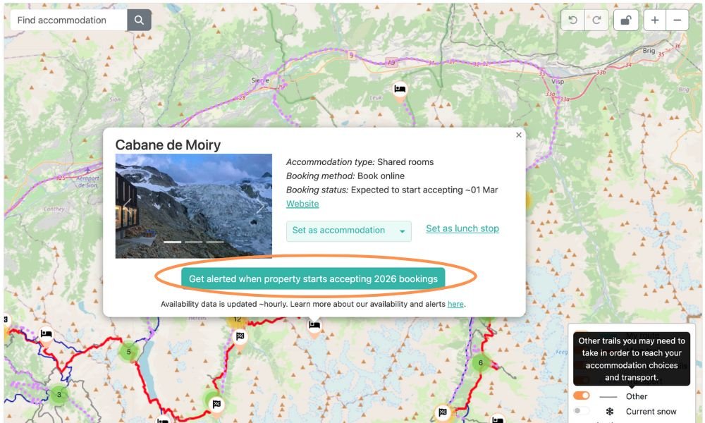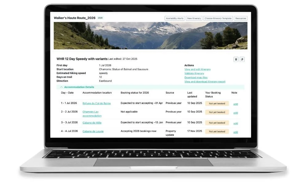 If you’re reading this page, you’ve hopefully drafted an itinerary and are ready to pounce on your target properties. Well done! Unfortunately, though, it’s not usually that straightforward. Some properties accept bookings 12+ months in advance, and others accept bookings only 3 months before the season opens. To make it easy for you to stay on top of your bookings, we’ve collected the booking status of 150+ properties at 55 locations along the Walker’s Haute Route trail.