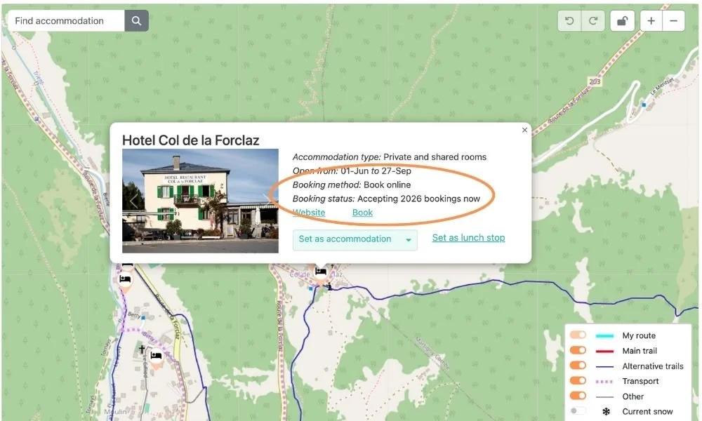 All our self-guided Walker’s Haute Route packages include access to our planning app. The web-based app shows the booking status for all accommodation locations, with a “Book now” link. We redirect you to their preferred booking method, including directly on their website, their online booking engine partner, or email.
