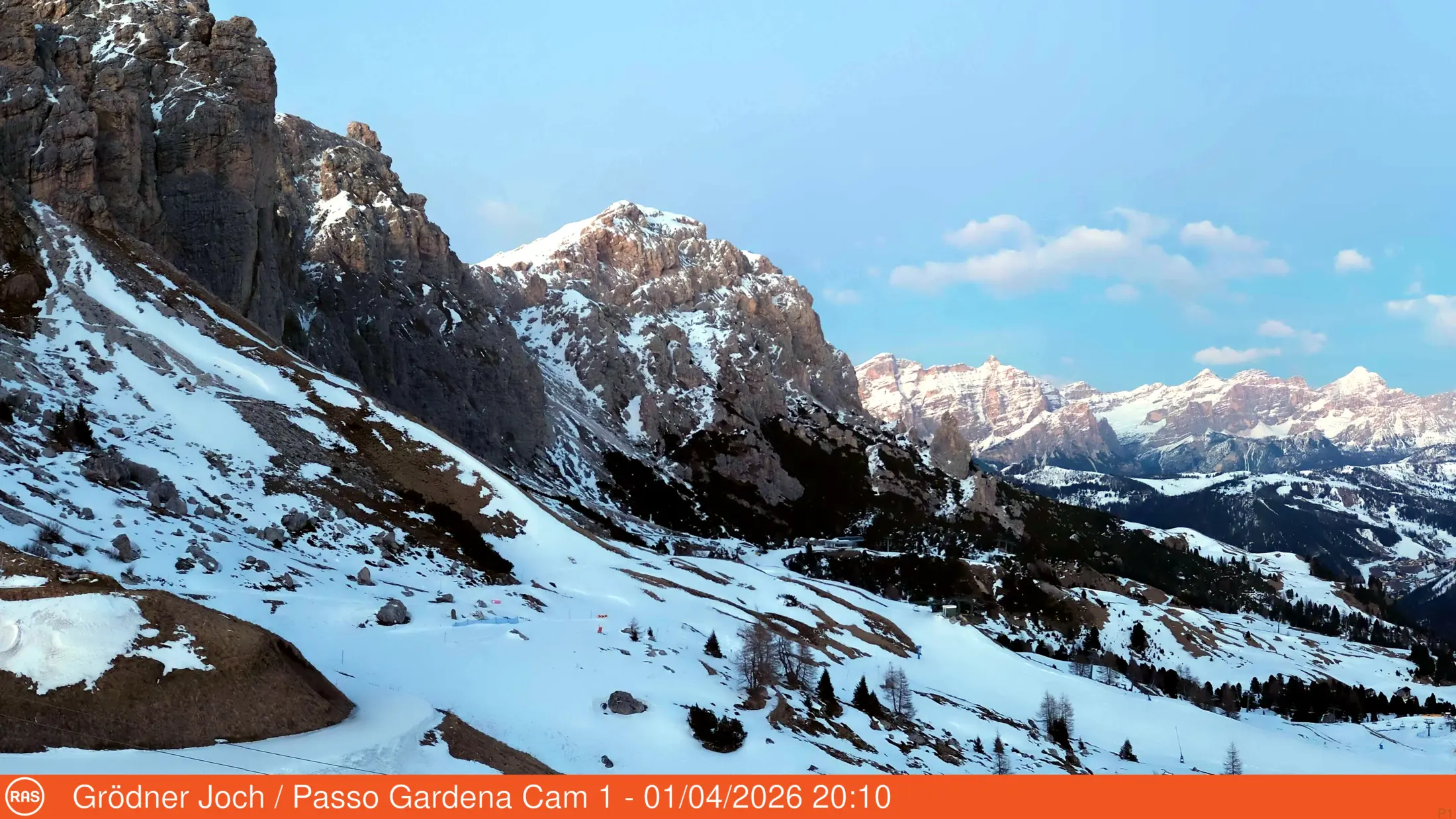 This is a great camera that shows the panorama from Forca Rossa in the East, across Soraga hamlet, all the way to Col Margherita (and the cable car that connects Passo San Pelligrino with the peak).