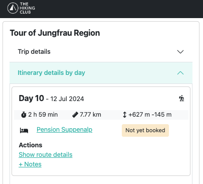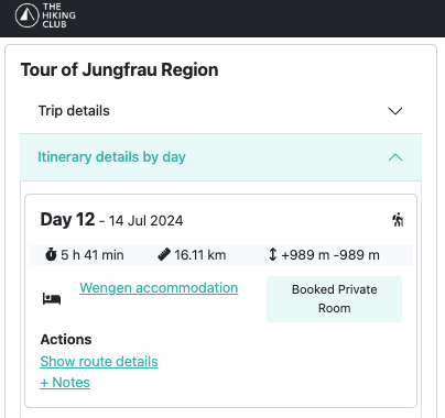 Day 12 hiking stats for Sam and Steve’s itinerary, as displayed in The Hiking Club planning app.
