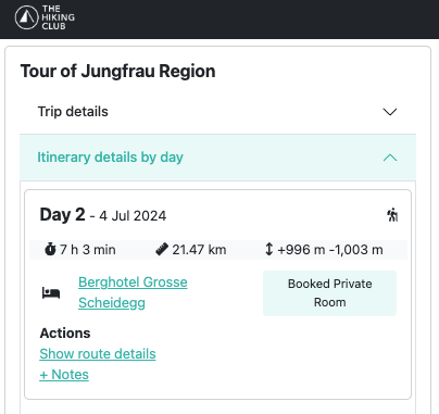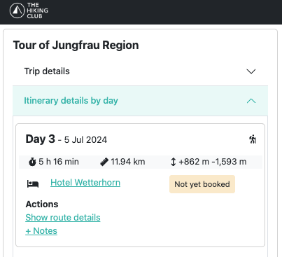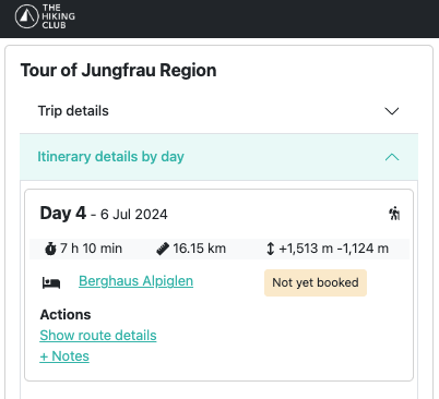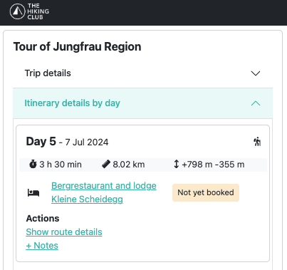 Day 5 hiking stats for Sam and Steve’s itinerary, as displayed in The Hiking Club planning app.