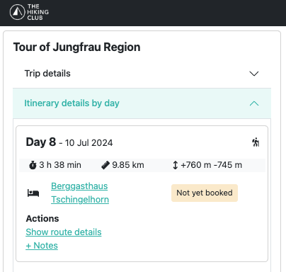Day 8 hiking stats for Sam and Steve’s itinerary, as displayed in The Hiking Club planning app.