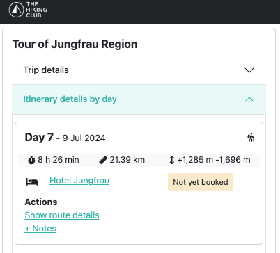 Day 7 hiking stats for Sam and Steve’s itinerary, as displayed in The Hiking Club planning app.