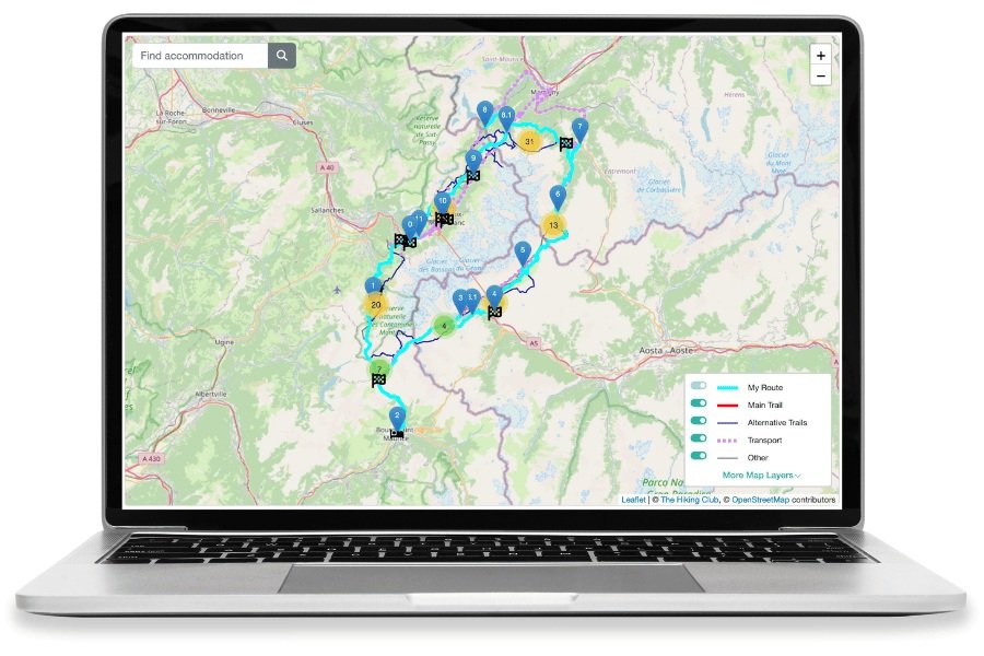 If you aren’t sure where to start when creating your Tour du Mont Blanc itinerary, why not view our range of templates, differing by hiking day, accommodation type, and route options. Instantly load it within your planning app to view hiking stats per day, route and accommodation details. Either use this to start booking your accommodation, or personalise the itinerary to change the route, accommodation locations, start/end locations, hiking speed and more.