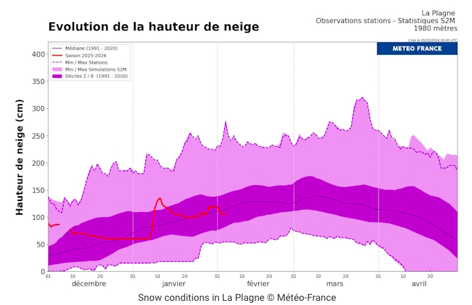 For the French Alps, Météo-France reported that after the snowy spells of late January and February, snow cover became above average across the massifs in February, and in some Alpine sectors there was more than 3 metres of snow above 2,000m.