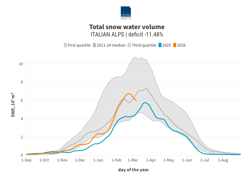 According to CIMA, in the Italian Alps as a whole, snow water equivalent is currently about 12% below the seasonal average and the melt phase has started around a month earlier than the typical historical pattern. The main cause of this acceleration is due to the significantly warmer than average temperatures.