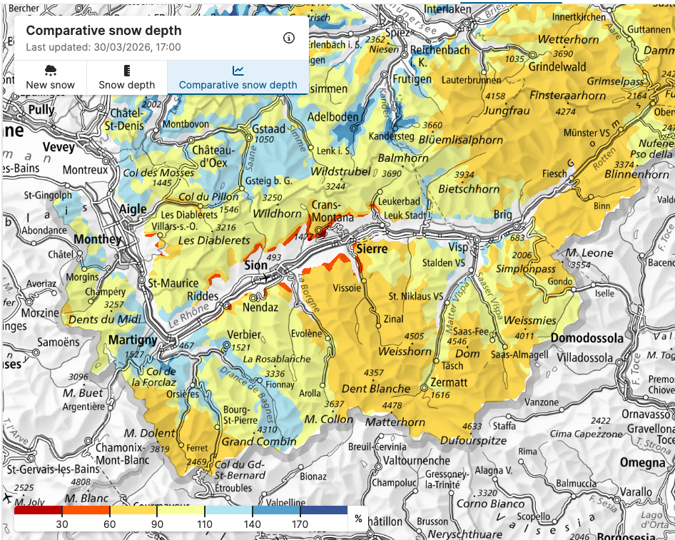 According to WhiteRisk, comparative snow depth in Valais and Bernese Oberland regions are mostly 60-90% in comparison with the long-term mean. There are some isolated areas with above average, including nearby Grand Combin, Kandertal and Adelboden.