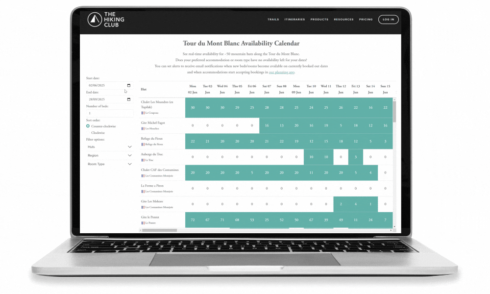 See real-time availability in an easy to use calendar format for 48 mountain huts along the Tour du Mont Blanc trail. You can change dates, filter by specific huts, regions and/or room type to narrow your search.