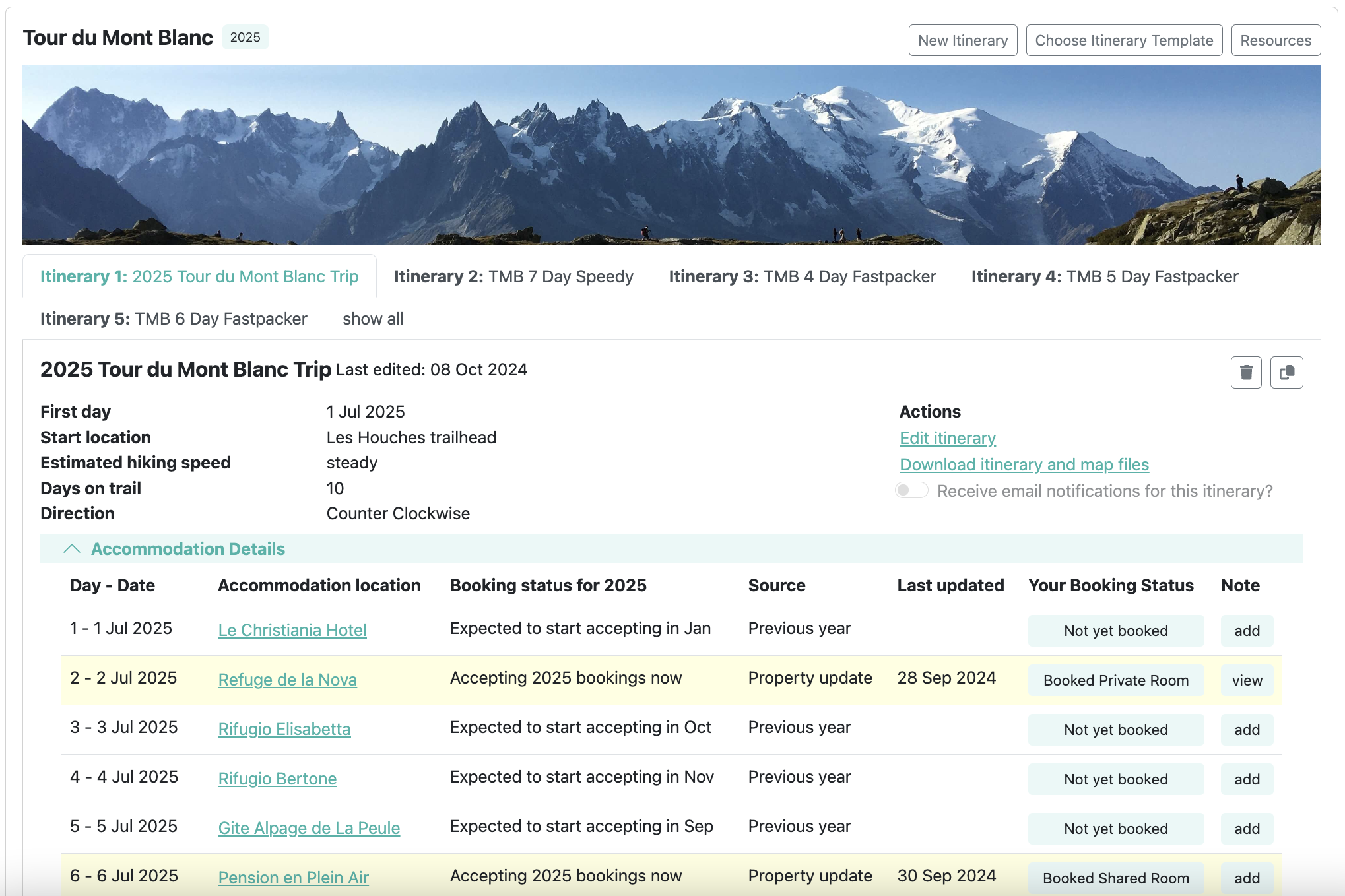 Accommodation Notifications (coming soon): This table will highlight any property you have included in your itinerary, if the date you plan to stay falls outside of their opening dates. This is especially important for those planning to hike at the beginning or end of the hiking season, however, occasionally properties will make a late decision to delay their opening due to their still being significant snow, or, decide to renovate instead of opening as planned. While these situations are rare, there has been at least one per season across each trail we support which impacts lots of hikers.