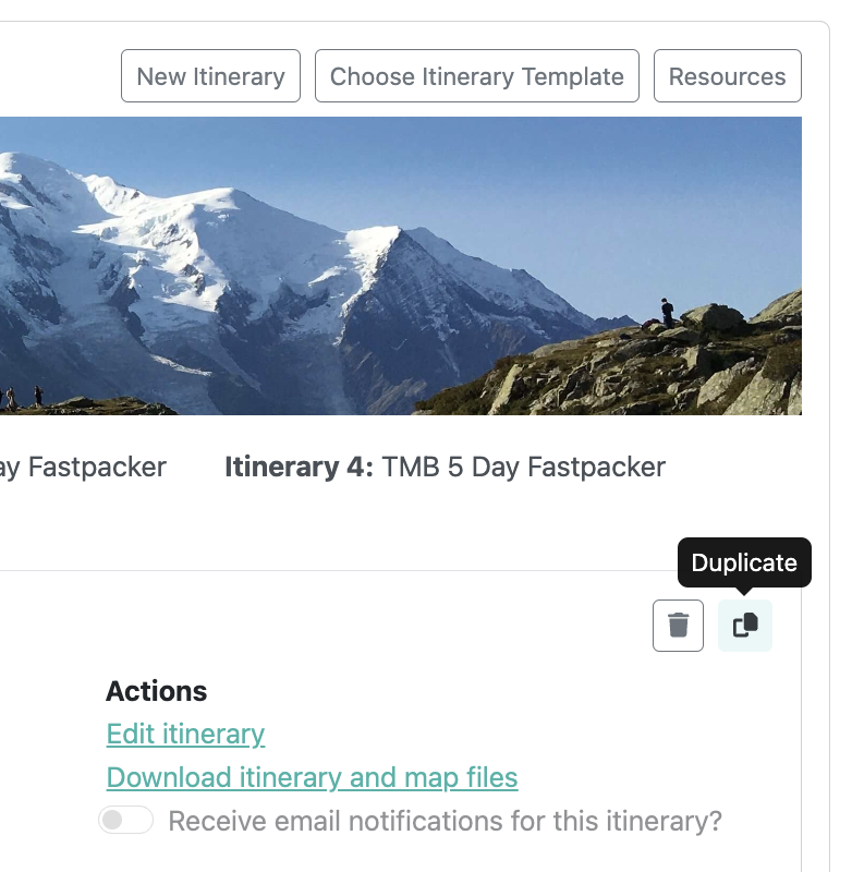 For actions related to an itinerary, like editing or accessing the itinerary report and map files, these sit within each itinerary.